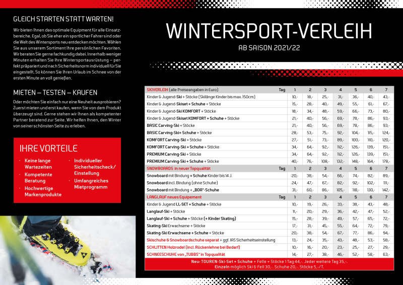 Wenn Ihr Euch für einen Ski- oder Schuhkauf interessiert, könnt Ihr viele unterschiedliche Modelle leihen und ausgiebig testen. Bei Kauf ist ein Tag komplett gratis.